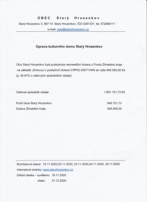 Obci Starý Hrozenkov byla poskytnuta neinvestiční dotace dotace z Fondu Zlínského kraje.